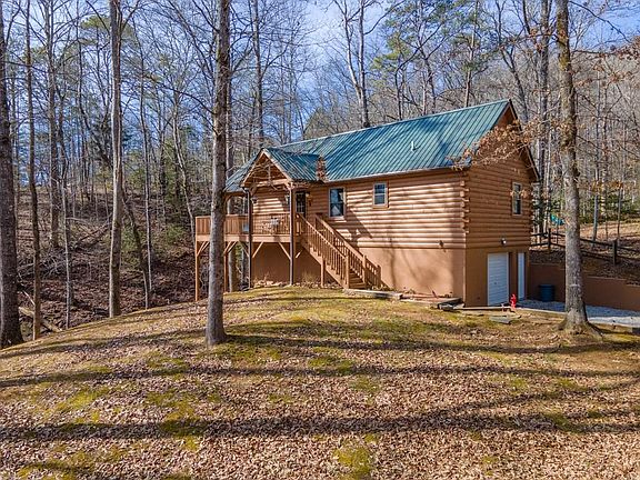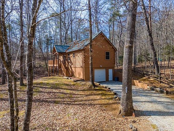 Very nice Log Cabin and you own both sides of the babbling stream which you can enjoy from the two-sided wrap-around porch. Or maybe put a fire-pit beside the stream and enjoy those summer evenings. The main level has tall vaulted ceilings with an open living/ dining/ kitchen. Also on the main level is the primary bedroom with double closets and a full bathroom PLUS a guest half bath on the main level. Those vaulted ceilings extend into the large loft with an 8'6" headspace down the center of the loft for easy access to the space. (The loft measures 19 x 19 at floor level.) So pull the ladder out from the wall and upstairs you will find plenty of room for additional sleeping quarters or a library or a craft room... Beautiful hardwood flooring throughout the main level and wood laminate in the loft. The 1.39 acres are partially wooded with a winter mountain view. The full basement is accessed from the outside with a single garage and washer/dryer area.