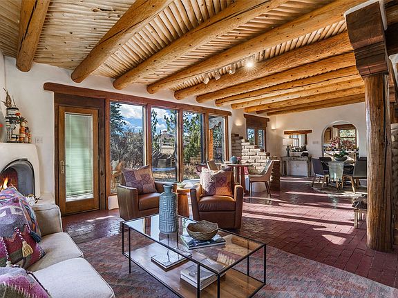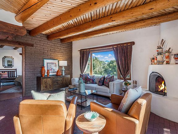 Sited on two and a half acres in a bucolic rural setting with pretty Sangre de Cristo mountain views, this charming Pueblo style adobe home offers traditional architectural details such as beautiful wood ceilings of vigas and latillas, also coved ceilings with vigas, plaster walls, solid wood doors, wooden lintels, brick and Saltillo tile floors, Talavera tile, and a kiva fireplace. The property features beautiful large pine trees, an enclosed yard with perennial plantings and lovely flower gardens, and a synthetic wood deck. The studio space is fitted with blackout window coverings, so it can be used as a dark room as well. The original infrastructure has been upgraded: the electrical system, new mechanical room with boiler and water heater, roof and stucco, and the well was recently maintained with new pressure tanks installed. There’s also a small horse barn on the lot. Quintessential Santa Fe!