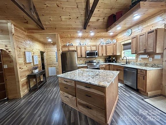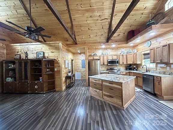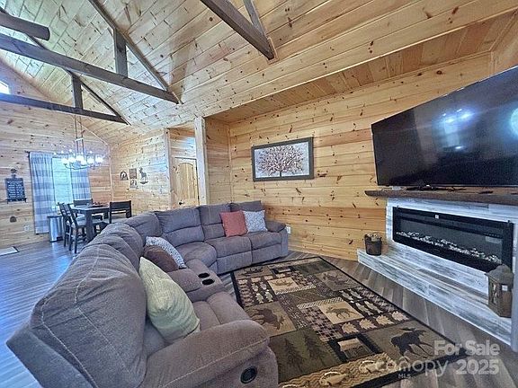 Move in ready boasting an open-concept floor plan with a spacious kitchen island and stainless-steel appliances.. The living room area features an elegant electronic fireplace, vaulted ceiling and French door that leads to a large, covered deck, offering a serene view of the surrounding mountains. The main floor includes two bedrooms, a full bathroom with built-in laundry facilities, and a primary suite with a private bath. The daylight basement is equipped with three French doors and a partially finished bedroom, bathroom, and storage area. The remaining portion of the basement is completely open for customization. Exterior amenities include a firepit and multiple parking spaces adjacent to the home and near the basement area. Situated in a desirable neighborhood just 6 minutes from downtown Bryson City, this home is ideal for single-family occupancy or as a short-term rental. The property comes fully furnished.