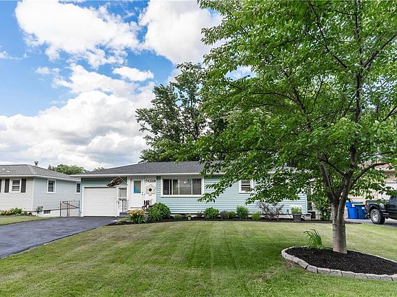 Charming ranch home located on a quiet tucked-away street in East Irondequoit! Updated entryway invites you into this perfectly laid out home. Large eat-in kitchen opens to family room for easy entertaining. Three good sized bedrooms, with updated full bathroom all on the first floor! Hardwood floors throughout first floor, and updated vinyl flooring in kitchen as well. Newer windows throughout entire home, and freshly painted interior brighten up this property! Most appliances are newer, and all are included! Vinyl sided with new roof in 2014! Additional living space in finished basement not included in square footage! Full-sized walk-out basement opens up to a fully fenced in yard perfect for entertaining! Fresh landscaping, both in the front and back of this beautifully maintained home! Available to be shown Friday-Sunday, delayed negotiations Monday 6/29 at 12PM. Book your showing today!