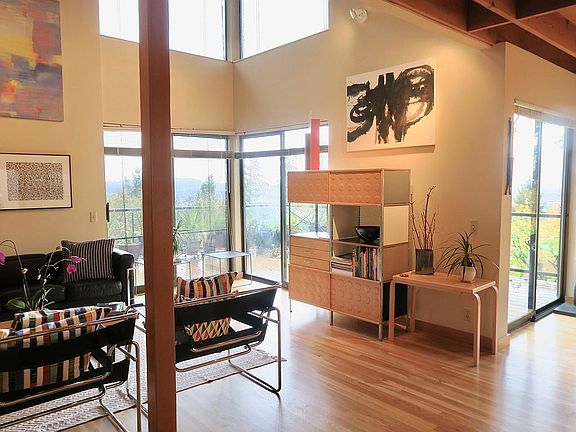 Absolutely a rare find, architect designed contemporary home with a spectacular views from all living spaces and bedrooms in the desirable Fairmount Neighborhood. Three bedrooms, each with spectacular view, plus there are two additional rooms: one is 360 sq. feet light filled art studio with high ceiling with a great view of the woods, which could be a family room, 4th bedroom or office, which also has access to outside. There is also an independent home office/studio (250 sq.ft.) under the main part of the house, which includes a separate large storage/utility area with closet that can be used as wine cellar. Light-filled 2-story living room opens to large dining area,both opening to wrap-around deck which is like a outdoor dining/living room. A huge master bedroom with separate space that can be used as a study/exercise area. Second bedroom with a vaulted ceiling with beautiful colored concrete floor. The third bedroom with sliding door offers a spectacular view/ Walking distance to the University of Oregon and few minutes walk from the woods at the Hendrick's Park. The interior offers contemporary tasteful fixtures, wood floors in the living and dining areas. There is a great combination of being in the woods and close to the day to day activities.