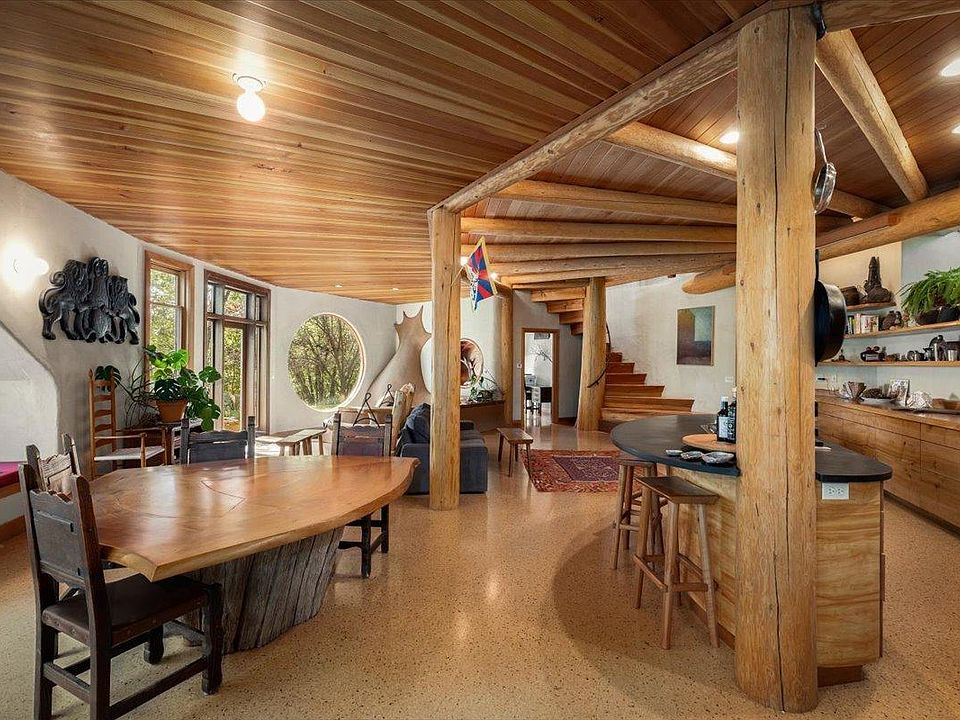 Back on the market by no fault of the property. Breathtaking view, finest materials & amazing livability create high-end Modern Organic classic. Timber-framed w/local cedar. Salvaged old-growth redwood custom entry doors & accents throughout. 2.5" thick madrone countertops, shelves, custom table & cabinet doors create cohesive, restful feel. Sunken seating w/sculpted kiva fireplace & 7' round window exquisitely frames western view. Circular staircase w/hand-forged railing wraps up & around 2-ft-wide cedar trunk. Master BR w/ stunning 180' treetop view + steam bath, walk-thru closet. Powder room + full bath entry level. Additional dwelling & outbuildings quietly placed on 10-acre parcel. Private two-level 1487 sf cottage w/ground-level studio + gorgeous, sunny upper level room. Contemporary 14x32 barn w/custom cabinets, built-in bunks, sunny bath & huge windows offers extra lodging & significant storage. 8000 Gallons of water storage! 2 large garden areas.Possibilities!