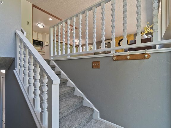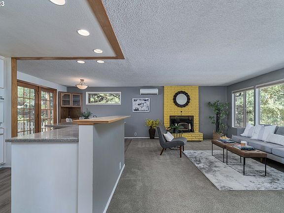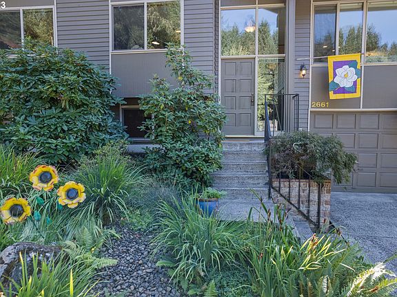 This serene home in the SW Hills of Eugene is located at the end of a culdesac, has treed views and shows pride of ownership. The main level has an open-concept living room with fireplace and oversized picture windows taking in the view; the kitchen has European cabinetry, quartz and formica counters, eating bar and LVP flooring; the dining area has 2-corner cabinets, LVP flooring and a French door to the deck; the hall full bath is remodeled; the 2-guest bedrooms have closets; the restful master suite has a remodeled full bath with shower; the lower level/daylight basement has a family room with fireplace; remodeled full bath; 4th bedroom with double closets; laundry room with laundry chute; and access to the garage. The large private backyard is a gardener's paradise with beautifully landscaped beds, whimsical art features, expansive deck with pergola and partial cover, garden shed, garden box, drip system, and a large grassy area. There is RV parking and neighborhood nature trails. This is a great home for families liking seclusion and privacy within the city.