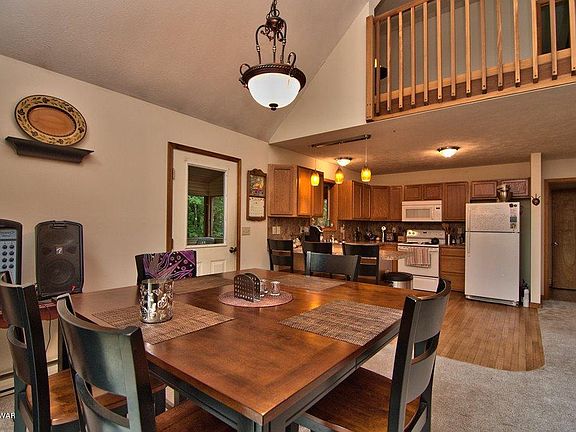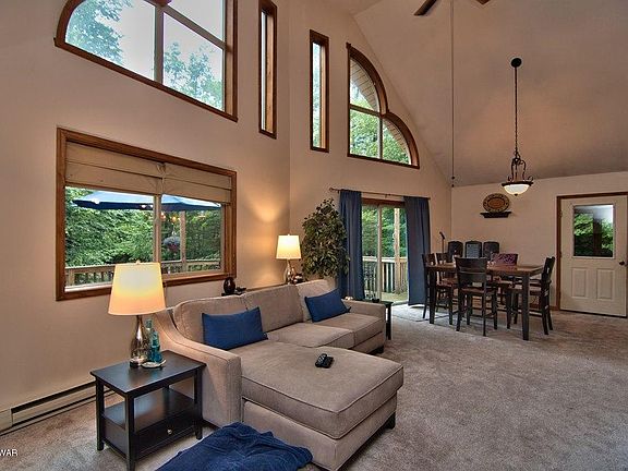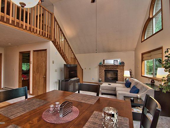 Beautiful Chalet on a nice level lot in a four season amenity filled community in the Northern Poconos. This home features an open floor plan with cathedral ceilings, master bedroom with walk in closet on the main level, screened in porch, two bedrooms with vaulted ceilings on the second level as well as a loft. The lower level has a finished family room and bedroom. The amenities include lakes, beaches, pools, clubhouse with restaurant and pub, golf course, ski hill, tennis, indoor recreation complex with tennis/fitness center/arcade and more, basketball courts, ball fields, children's playground, miniature golf, walking trails, arts and crafts, a great recreation program including day camp for kids, campground, 24 hour security, gated access, must have an appointment with an agent