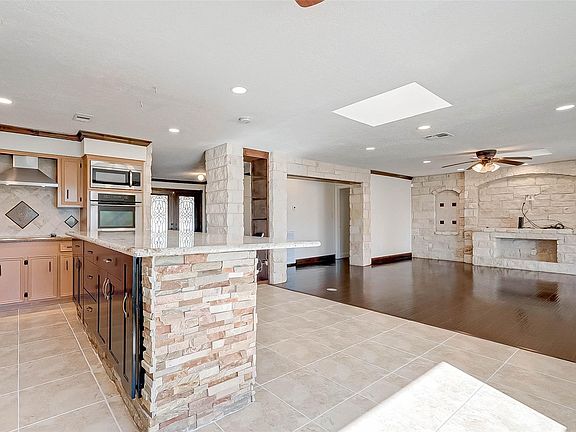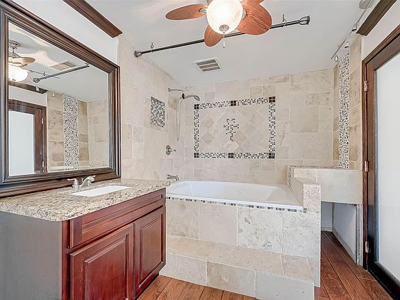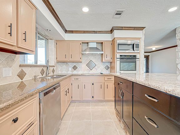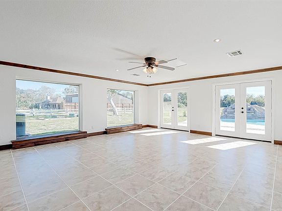 This property at 26611 Meadow Lane in Katy, Texas, features a spacious layout with modern amenities. It has a well-maintained exterior, an open-concept living area with high ceilings, and large windows. The kitchen includes stainless steel appliances and granite countertops. The master suite has a walk-in closet and an en-suite bathroom. Additional features include a pool, pool house, two-car garage and a cozy backyard patio.