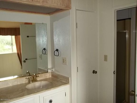 Single wide on over 1/3 ac with living room extension and one on the rear that can be office/extra bedroom/storage or laundry area, with a door & porch off this room. Living room is large with a wood/gas burning fireplace and a covered porch on the front. 1 AC unit & 1 Evaporate cooler, less than 4 yrs. old. A stem wall has been put under the home and coolant paint on the sides and roof of the home. Split floor place, MB has a bath in that space and the other in the hallway. Kitchen has new counter tiles and the flooring & carpet is in good shape throughout. Wood beams on the ceiling some antique lights. A quite area, lots of trees and landscaping. There''s a drainage area in the rear and the property line is beyond that and it''s a nice separation from the properties in the rear.