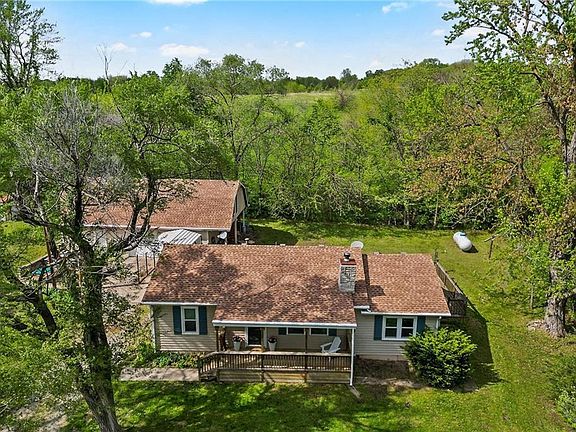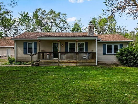Charming property backs up to Watkins Mill State Park. This one level ranch home offers a South facing front porch and East facing deck with beautiful views of the park. Inside features 3 bedrooms, full updated bath, wood burning enamel stove, gas cooktop and built-in oven. The detached barn has garage doors, oil pit, loft space and a concrete cellar with water spigot. In addition to the barn, there are 2 storage sheds that remain with the property. Lots of space to garden and enjoy the country! This property is located between Kearney and Excelsior Springs.