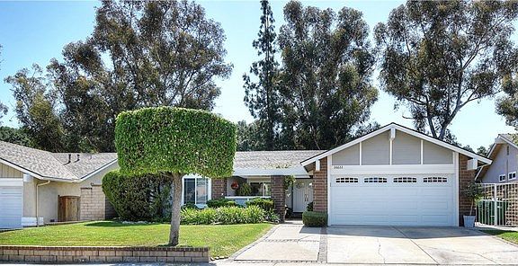 Park-like setting backing to a large greenbelt with massive oak trees, makes this location peaceful and serene. This single story 4 bedrooms, 2 bath home shows "true pride of ownership." Entering through custom double doors with stunning hardwood floors makes this home warm and inviting. All windows and sliders replace with double paned vinyl. Upgraded kitchen with refaced wainscoting cabinets, double sinks, newer appliances and custom molding frames the large kitchen window looking out to the private backyard. French doors access one of the secondary bedrooms that is currently being used as an office with built-ins. Upgraded hall bathroom with travertine floors and vessel sink. Master bath has furniture vanity, walk-in tiled shower and tiled floors. Master bedroom has mirrored wardrobes and slider to fabulous yard that has an aluminum patio cover, stamped concrete, plenty of grass, nicely landscaped with an added water feature to relax and enjoy the scenery. Low taxes, low association and Mission Viejo Lake membership