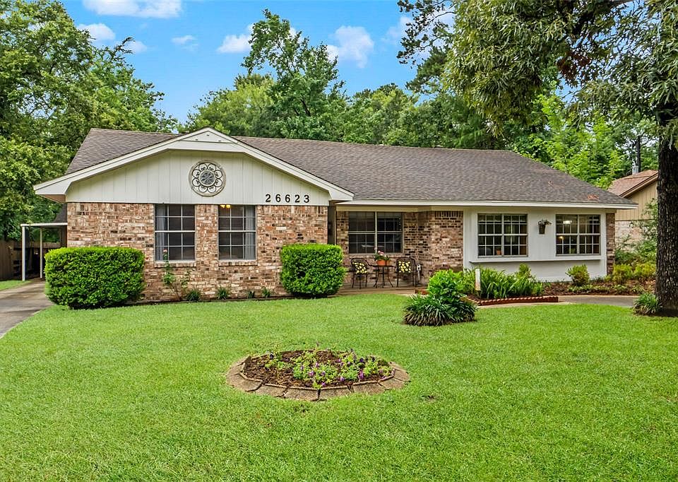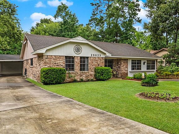 Charming one story home in desirable Oak Ridge North on a large 14,025 sq ft lot. This 3 bedroom 2 bath brick home has all the character of an older home with large sized rooms yet has a modern feel with some of the upgrades. The garage was converted to an extra large den years ago and there is a huge detached 3 car garage with a carport. The cozy fireplace and striking bay window in the dining room adds to the charm of this home. This home features laminate flooring in the living and dining area, tile in the study and kitchen and carpet throughout the rest of the home. You are greeted at the front of the home with a small intimate patio perfect for morning coffee. Relax in the evenings in the covered patio in the back yard surrounded by mature trees. No HOA makes this home even more attractive. Easy access to shopping and I-45.