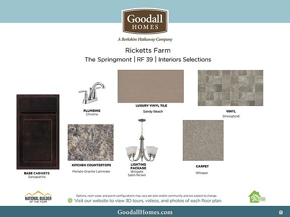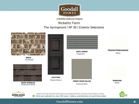 Under Construction-Estimated Completion Dec 2021 The Springmont is one of six wonderful floor plans offered by Goodall Homes in the beautiful Ricketts Farm community. The Springmont comes with a great room, dining area, covered porch, kitchen with an island. With 3 bedrooms 2 full bathrooms, 1 powder room, a spacious upstairs loft complements the 2 upstairs bedrooms. Included is a wiring package with CATVI. Selling out of Magnolia Terrace Model Home located at 27266 Leeta Lane, Athens Alabama 35613, use GPS. Hours are Wednesday 1-5pm, Monday, Tuesday, Saturday 11-5, and Sunday 1-5.