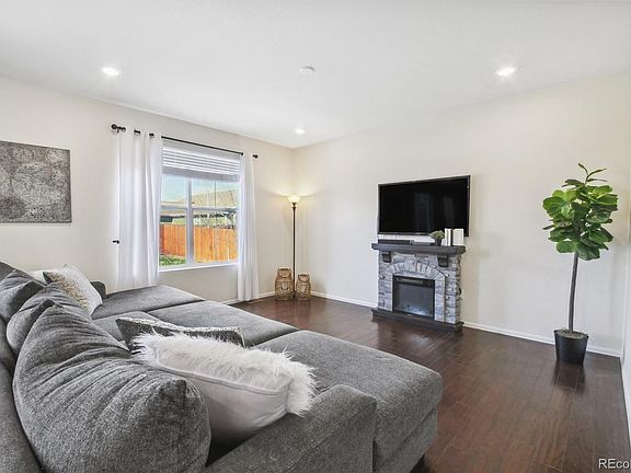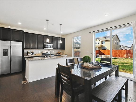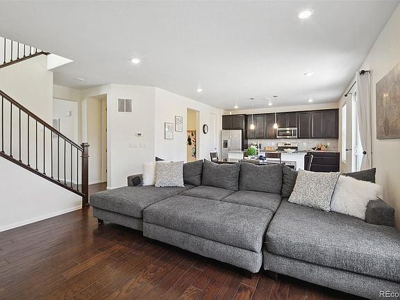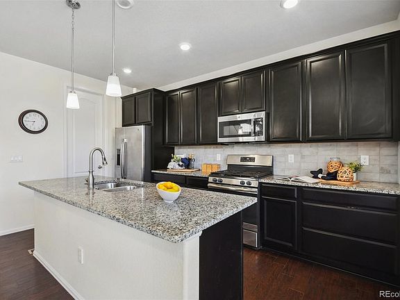 Welcome home! Gorgeous 3 bedroom, 3 bathroom two story home. Main floor features open kitchen with granite counters, large pantry, stainless steel appliances (including gas range) and rolling shelving. Dining space, cozy living room, flex space/den (perfect for office or playroom) and powder bathroom. Extended wood floors on the main level. Spacious primary bedroom upstairs with walk-in closet and private 3/4 bathroom with dual sinks, granite counters and oversized shower. Two additional bedrooms, full hall bathroom and convenient laundry room with extra cabinets and folding table (washer and dryer included). Finished basement, perfect for entertaining with included pool table, leather couch, projector and screen. Additional storage and customized built in shelving/cubbies. Finished two car attached garage. Backyard professionally landscaped with built-in, wood burning firepit and sandpit. Completely move-in ready home. 27J School District. Within walking distance to two neighborhood parks and tennis courts. Join in on neighborhood events through the metro district social committee. Easy access to I-25, E-470, shopping, dining and entertainment. Don't miss this one!