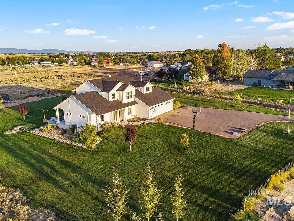 Live your country dream with no HOAs or CCRs in this custom built 5 bdrm/3.5 bath home with views of Bogus Basin and endless rolling hills! Home features 2 master suites, with one on each level. Main floor includes a large living room with fireplace insert, den, office or extra bdrm, utility/mud room, 1/2 bath, large dining area, open kitchen, pantry, farmhouse sink, granite countertops, wide plank laminate flooring, and one master suite with full bath. Upstairs includes a family room, large master suite with attached outdoor deck, master bath, 3 more bedrooms with full bath, and laundry room. Large 3 car garage has extended bays. 4.73 acres with possible 2 acre split has a fruit orchard, chicken coop, garden area, and large backyard patio. New roof in 2022 and new exterior paint in 2021. Make this beautifully designed home yours today!