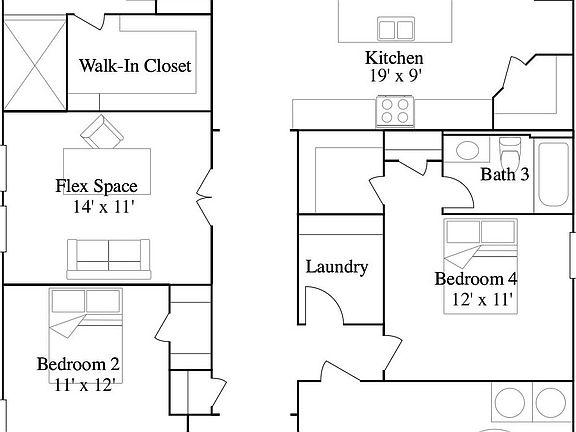 Shared: kitchen, living room, laundry, garage/driveway parking.