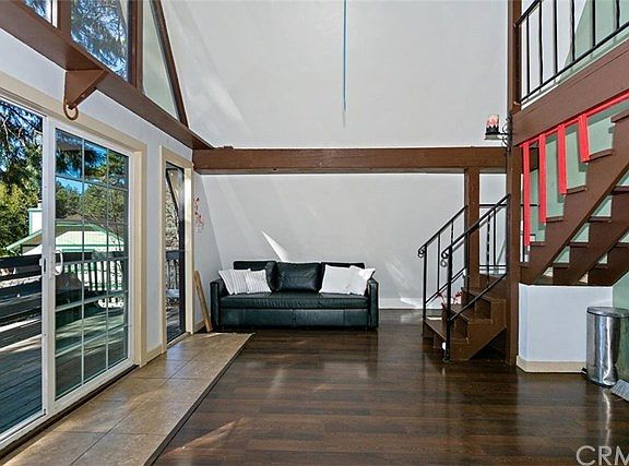 Stunning Alpine mountain cabin nestled among tall trees, featuring 3 bedrooms and 1 + 3/4 bathroom. Like an iceberg, only the tip is revealed to the street and offers an ideal private place for an escape to the mountains and lakes, usable as a vacation house OR a main residence! Amazing hiking, nearby skiing, access to Lake Gregory, and charming towns nearby. Incredible views. An huge deck with a comfortable built-in-bench and perfect for BBQ is shaded by huge sequoias and offers views of forest, mountain, and sky. The main floor (one floor down) is the heart of the house with a bright, spacious feel: a kitchen with open floorplan leading to the living room with a functional freestanding fireplace. A TWO-STORY GLASS WALL looks out to the deck & towering trees beyond, providing a stunning and dramatic view. This floor also has a nice bedroom with a walk-in closet. The top floor contains a wonderful peaked-roof room with a closet and direct access to 3 car parking deck. The bottom floor contains a master bedroom with bathroom and large closet, as well as a laundry nook, and a convenient separate access to the outside.Walkable to two restaurants in Rimforest (10 minute walk) and one in Twin Peaks (30 minute walk). Enjoy all the mountains have to offer: it might be the ski-slopes, or Lake Arrowhead Village, or whatever wonders you find. Make an appointment and plan to start your mountain adventure and living in this wonderful cabin!