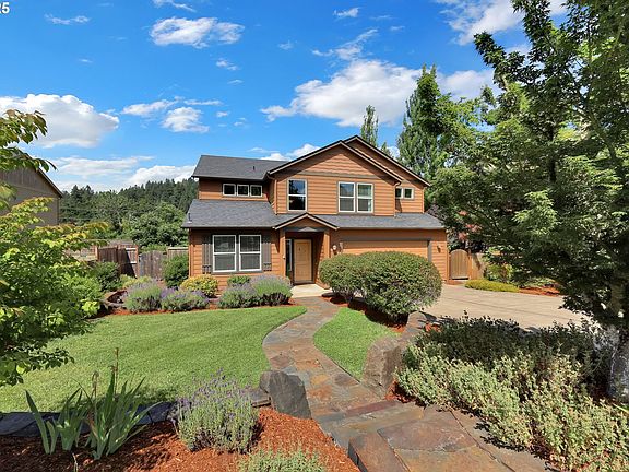 Tucked away at the quiet end of Augusta Street, this special home is the perfect mix of rural and urban. Situated just steps to Laurel Hill Park and having cul-de-sac privacy it really is an idyllic location. The quarter-acre lot offers stunning views of Hendricks Park and the Laurel Valley. The home has been lovingly maintained by its original owners since it was built in 2012. Step inside to find engineered hardwood floors, solid wood doors, vaulted ceilings, and a cozy gas fireplace that anchors the living room. The floor plan offers both comfort and flexibility, with a spacious main-level primary suite featuring a spa-like bathroom, and three generous upstairs bedrooms plus a large loft area/flex space. The beautifully landscaped and fenced yard includes blueberry bushes, raised garden beds, strawberries, raspberries, a fire pit and a deck that invites you to relax and take in the view at the end of the day. Located on a peaceful street, this home offers a sense of retreat with easy access to everything you need.