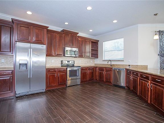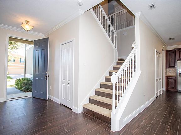 Stunning huge corner fenced property, features tons of upgrades and looks brand new! Too many options to list including wood looking tile in almost the entire home, huge walk in close, shower + tub master bath, front porch, covered lanai, level 4 cabinets and kitchen granite, crown molding, garage racks and much more!