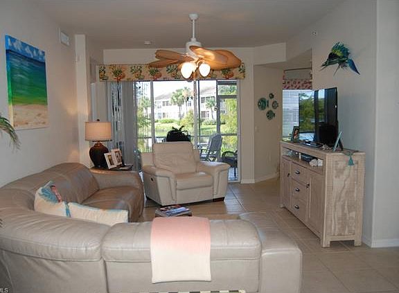 Awesome first floor lake view condo!! This is an exceptional 2 bed, 2 bath, den property with interior design to rival a model home! The beautiful, tranquil lake lies just beyond your screened lanai. As an added bonus, you will witness some of Florida's most spectacular sunsets. The home has all tile flooring, a lovely stone backsplash, maple cabinetry, walk-in closets in both bedrooms, and whole home intercom system. Easily closed hurricane shutters give you peace of mind. All appliances have extended warranties. The lovely designer cornices over the windows are included to maintain the Coastal Chic look now in vogue! Master bedroom suite has a large lake view and dual sinks. Somerville Loop offers it's own heated pool or you are welcome to spend time at the larger, award winning community pool at the main clubhouse. There are miles of walking and biking trails, 2 doggy parks, a fishing pier with picnic cabanas, tennis, bocce ball, pickle ball, a fitness center and more. Restaurants, shopping and theatre are within an easy drive. Come live the ultimate paradise lifestyle in the friendliest gated community in SW Florida!!