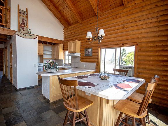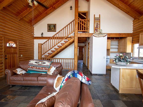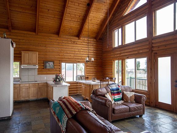 Beautiful real wood Log Cabin on 2.5 acre property! Great open floorplan 3 bedrooms, 2 baths, slate flooring thru-out, grand cedar plank ceilings with ceiling fans, open log staircase to upstairs, gorgeous floor to ceiling windows for the terrific surrounding views, cozy claw foot bathtub in Master Bath, large Laundry room, large deck with railing, full RV hookups, and animal rights. This is a beautiful Real Wood Log Cabin!