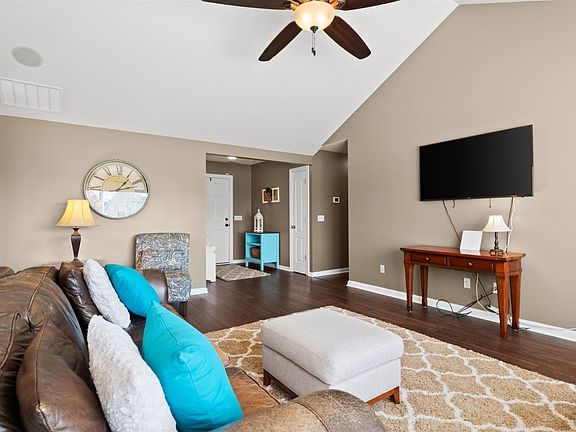 This is Towne Square! A beautifully appointed 3 bedroom 2 bath home in the community of Huntertown. The open concept 1330 square foot floorplan is move in ready. Recent addition of laminate hardwood flooring throughout updates the styling and makes for ease of care. Freshly painted bedrooms and new matching cordless blinds throughout the home demonstrate the continuity of design. A Cathedral ceiling great room with ceiling fan enjoys plenty of daylight from the southern facing wall of oversized windows. A well-appointed kitchen with tons of cabinet and counter space, center island sink, pendant lighting, and breakfast bar is a great place for daily dining or entertaining guests. Table dining enjoys the surrounding views of the open backyard and patio from the bump out breakfast area with sliding door and oversized windows. Laundry is conveniently located just off the entrance to the home from the garage and enjoys it's own room. No worrying about pass-through facilities that hamper traffic flow. A large 15 x 12 master bedroom with double windows overlooks the backyard and common area and features a walk in closet, dual vanity sinks, and tub-shower combo. The additional full bath serves bedrooms 2 and 3 and is conveniently located for guests. The backyard opens to a large common area that buffers the proximity to neighbors and allows for additional space to entertain and play. A great small town feel but within minutes to shopping and dining, or a short walk to the Huntertown dog park! Served by award winning Northwest Allen County schools, come see why this house should be your next Home!