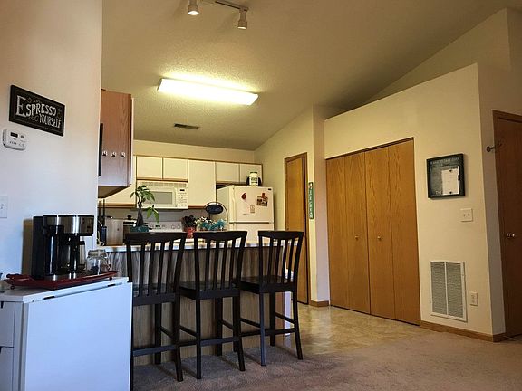 Sunny, light & bright top floor condo with vaulted ceilings & great storage. Fresh paint in current, popular color, newer carpet, new kitchen vinyl & glass block subway tile backsplash by oven. Open LR & kitchen creates a spacious feeling. Kitchen w/ breakfast bar, nice size pantry & laundry closet. Enjoy sunsets from the deck or watch the world go by! Convenient, efficient living.Detached 1 car garage, access to clubhouse for gatherings as well as to the work out room. On bus line. A joy to call home!