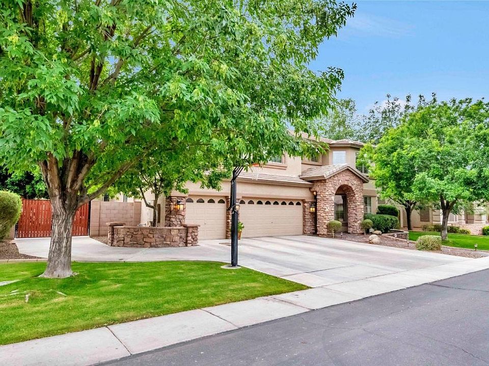 Beautiful home in highly desirable Grand Reserve gated community! Great Chandler location close to freeways & shopping. Move-in ready. Walk-in closets, 3 car garage, stone on exterior, 3 fireplaces, shutters, wood floors. Updated kitchen w/ dining nook, stainless steel appliances, maple cabinets, granite countertops. Kitchen opens to family room w/ large stacked stone fireplace. Master suite is stunning w/ sitting room, 3-way fireplace, walk-in custom closet. Master Bath fully remodeled w/ Carrara marble floors/counters, double vanity, frameless glass rain shower & body jets, cast iron tub. Paradise backyard w/ large covered patio, Pebble Tec pool w/ rock waterfall, outdoor kitchen w/ built-in grill, sink, fridge, bar, fire pit. Mature trees & citrus, grass area, playground, raised garden.