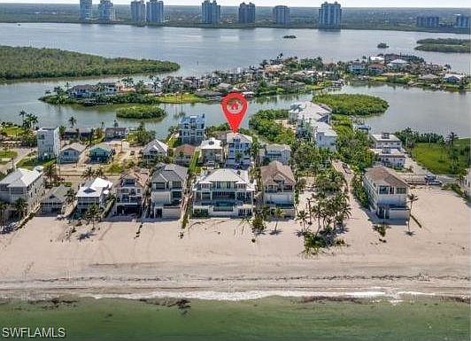 Coastal luxury meets laid-back island living in this beautifully designed 2019 multi-level home, perfectly positioned just steps from the quiet, uncrowded shores of Little Hickory Island in Bonita Springs. A true gem for beach lovers and boaters alike, the property offers direct Gulf access in minutes from its private boat dock. A major standout feature is the first-floor elevation of 21 feet, including the pool, spa, and all pool equipment—also at 21 feet. This elevated design not only provides exceptional protection from storm surge, but also enhances everyday living. Unlike typical builds where the pool sits 20+ feet below the main living area, this home offers seamless indoor-outdoor flow, with the saltwater pool and spa on the same level as the kitchen, living, and dining spaces—a rare and valuable layout. Light-filled and thoughtfully styled, the home features soft coastal hues of blue and white, paired with warm hardwood floors and natural textures throughout. With 4 bedrooms plus a dedicated office or optional 5th bedroom, there’s space for everyone to relax and unwind. The second-floor lanai offers an exceptional indoor-outdoor experience, complete with a saltwater pool and spa, outdoor kitchen, gas fireplace, sitting area, pool bath, and retractable hurricane screens—perfect for year-round entertaining or quiet evenings at home. Inside, enjoy 12-foot ceilings, shiplap accents, and a gas fireplace that add depth and character. The chef’s kitchen is outfitted with premium WOLF, SubZero, and Bosch appliances, a spacious island, butler’s pantry, and three laundry zones for ultimate convenience. This home is being offered turnkey furnished, including stylish pieces by Norris Furniture, as well as all bedding, linens, dishes, silverware, artwork, and decorator accessories—everything you need to move right in or begin generating rental income immediately. An elevator provides easy access to all levels. The third-floor primary suite feels like a private retreat, featuring a tray ceiling, spa-inspired bathroom with dual vanities, and a serene balcony with Bay views. Each of the additional guest suites includes its own bathroom, and a central wet bar makes this level perfect for relaxing. A rare 4+ car garage with front and rear entry offers pull-through ease—ideal for cars, golf carts, or boat storage. Whether you're looking for a full-time island residence or a high-performing vacation rental, this exceptional property delivers on both lifestyle and peace of mind, and even includes a transferable flood insurance policy. Just 35 minutes from the Southwest FL Airport and a short drive to Coconut Point, The Promenade, Mercato, and 5th Avenue—this is coastal Florida living at its finest!