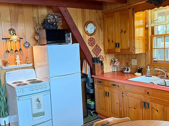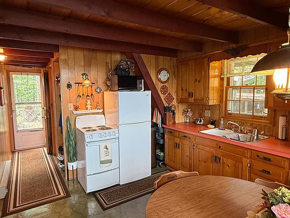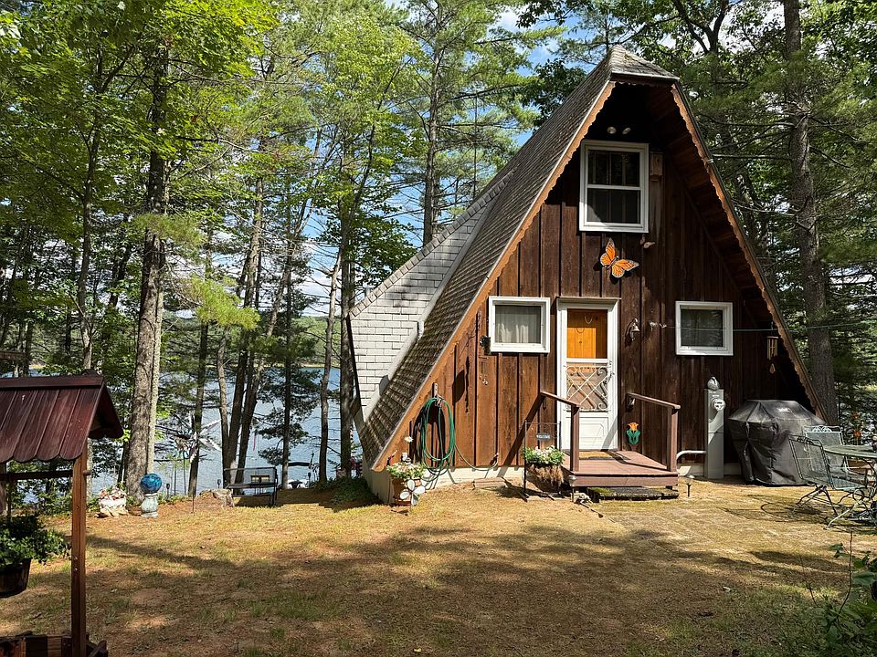 Can this BE any cuter? This cozy A-frame is the epitome of a Northwoods cabin. Built in 1969 by the sellers dad, this is the first time on the market. The knotty pine walls are pristine, and the views are amazing. With a small floor print, this was built with a well thought plan and some hidden storage spaces. The kithen, dinette and living room are open to the full wall of windows! There is a first floor bedroom and bath with shower only, and the 2nd floor bedroom has it's own loft space. The basement is home to lake toys, fishing poles, utilities and workshop space. There is an overheard door and walk out - you could finish this and have a great lake room!