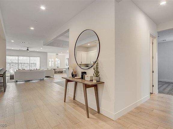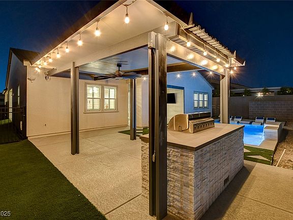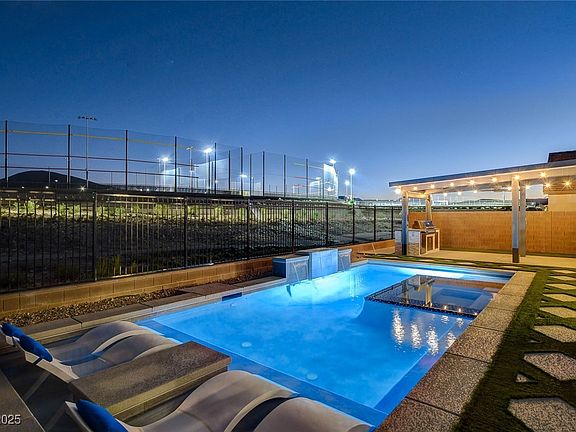 Experience refined living in over 3,000 sq ft of elegance in this Toll Brothers Donato Modern Farmhouse in Inspirada. Featuring $300K+ in upgrades and custom enhancements, this 3-bedroom plus flex, 3.5-bath home blends sophistication and comfort. The chef’s kitchen offers quartz counters, upgraded cabinetry, designer backsplash, and a large island. The great room centers around a 72” Primo fireplace and opens to an entertainer’s backyard with a heated pool, spa, built-in BBQ, motorized drop shade, and dog run. Inside, real hardwood floors and custom interior shutters add timeless appeal. The primary suite is a retreat showcasing a curated custom closet, soaking tub, walk-in shower, and dual vanities. The layout offers privacy with easy access to the flex space, ideal for a home office or gym. Additional highlights include a wet bar, enhanced insulation, and a water softener. Every finish and feature reflects an uncompromising attention to detail and a commitment to timeless design.