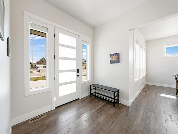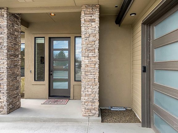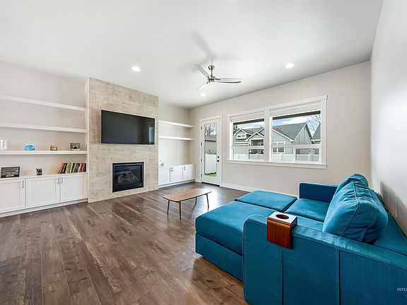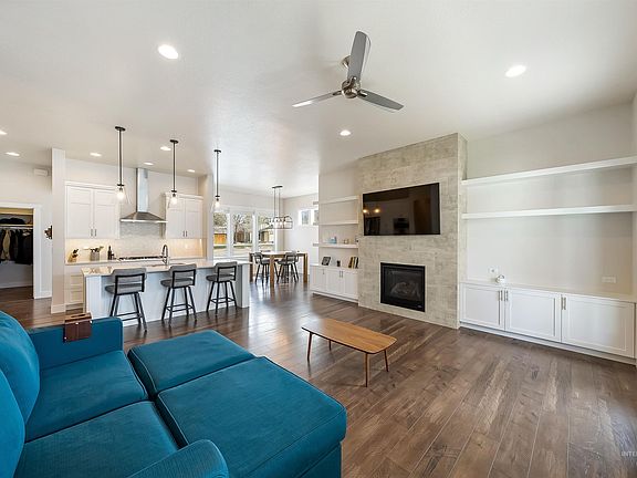 This stunning home greets you with its expansive open concept living space flooded with natural light throughout the day! Plentiful built-in storage ensures every item has its place, maintaining the sleek aesthetic of the interior. A tiled gas fireplace adds a cozy touch, perfect for evenings spent curled up with a book. Quartz countertops adorn the kitchen, complemented by built-in Bosch appliances, a huge pantry for all your culinary needs, and an adjacent dining room that provides the ideal setting for gatherings. Retreat to the large bedrooms, including a master ensuite boasting white modern cabinetry, tile floors, and a luxurious shower with dual sinks. The laundry mudroom adds convenience as well as the water softener system. The thoughtful design extends outdoors to the covered patio, where you can relax in the shade or entertain guests year-round. Located less than 10 mins from I-84 and just a short drive to Downtown Boise, this home offers the perfect blend of accessibility and tranquility!