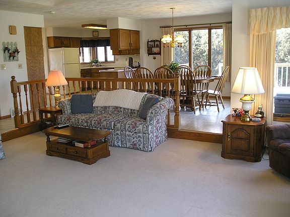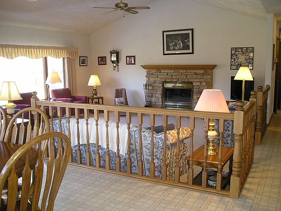 This Spacious and well kept 3 bedroom, 2 and a half bath ranch with unique design and open concept is bright and cheerful with lots of windows. Has a nice kitchen with plenty of counter space, pantry and cute breakfast nook; dining room overlooking a huge sunken great room with gas fireplace; First floor laundry; lots of spacious closets; partially finished basement; 3 car garage; nice wrap around deck with seating; steel siding, new roof, home warranty and great location!