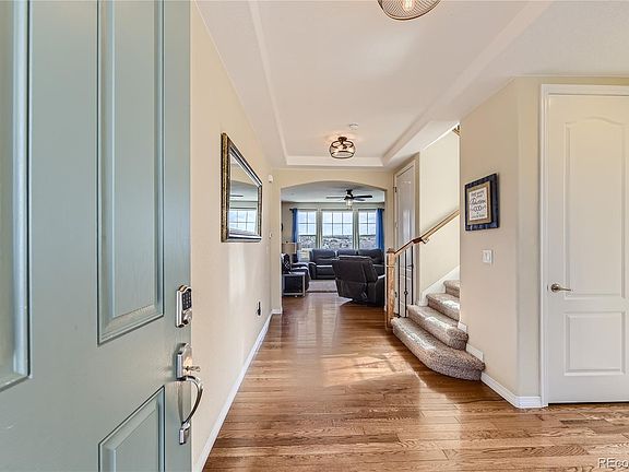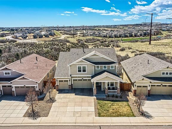 Welcome home to both beauty and function. Located in the vibrant town of Castle Rock and the highly desired Castle Oaks Estates/Terrain community where shopping, trails, and award winning schools are steps from your front door. Step inside the home where you are greeted with high ceilings throughout and beautiful wood flooring. This home has 2 office spaces. One full office with French doors and a 2nd pocket office is perfect for working or school from home. The open concept floor plan is great for entertaining. The family room with cozy fireplace and large windows that display natural light and views of the open space flows into a dining space and a nicely appointed kitchen. The kitchen has a large island with seating, granite countertops, backsplash, stainless steel appliances including double ovens and gas cooktop. There is a spacious pantry and plenty of cabinet space to add function. The mudroom leads into the 3 car attached garage. From the living area you can step out onto your low maintenance composite covered deck and enjoy views of the open space and a glimpse of Pikes Peak. Upstairs you will find 4 large bedrooms. The primary bedroom boasts coffered ceilings and large windows. The 5 piece bathroom has a soaking tub, a shower with bench, and large granite vanity. This flows into the spacious primary walkin closet. To add additional convenience and function, the primary closet connects to the laundry room with utility sink. All the bedrooms have access to bathrooms. One has its own private bathroom and walk in closet, while the 2 others share a Jack and Jill with private sinks. Pre-wired surround sound throughout! Dual HVAC system for efficiency and comfort! There is tons of potential in the full walk out basement. You can enjoy multiple seating and entertaining areas on the stamped concrete patio. Serenity awaits as you spend peaceful evenings on these outdoor areas with privacy and views. Don't miss the opportunity to call this beautiful home, YOURS!