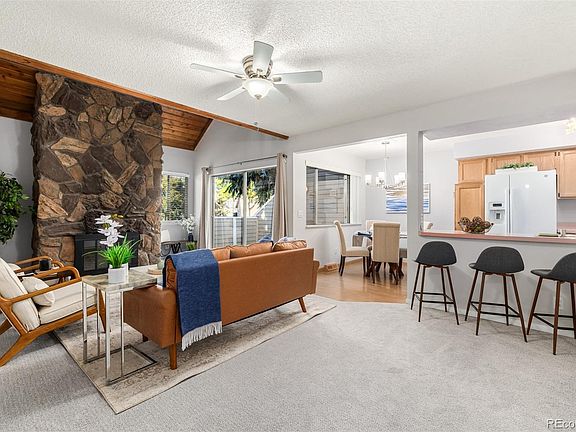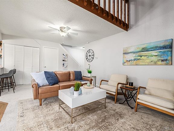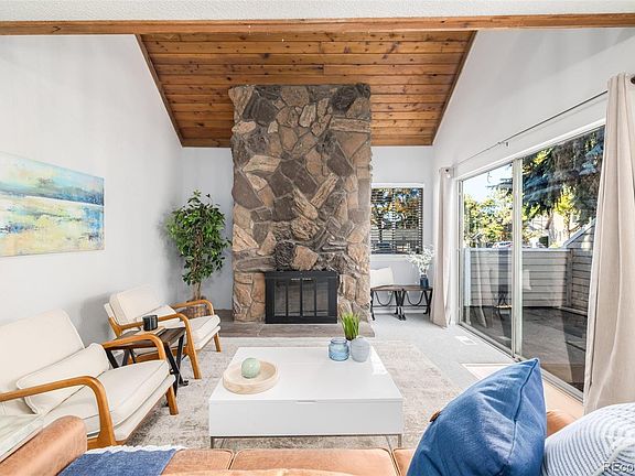 Welcoming two-level townhome (but main level living at its best!) situated in the popular Strawberry at Heather Ridge! You'll be captivated by the bright & airy 2 story tall living room featuring a stunning floor-to-ceiling stone fireplace, creating a warm and inviting atmosphere - wood paneled vaulted ceilings that add to the spacious feel, and sliding glass doors to the back patio. Massive entertaining space with the large living room has plenty of room for get togethers! The impeccable eat-in kitchen offers track lighting, honey oak cabinetry, built-in appliances, and wood flooring, located right next to an updated dining room large enough for all your friends! Large windows and sliders warm the open space throughout, giving views of the beautiful landscape and massive trees! Large primary bedroom on the main floor with large closets and plenty of light. Main level laundry just steps from the main floor bedroom. Upstairs, the second primary bedroom, a loft-style retreat showcasing plush carpet in all the right places, a walk-in closet, outside balcony access, and a private bathroom, ensuring your comfort and convenience. Outside, enjoy mature landscaping maintained by the HOA, with huge trees and plenty of open space! Clubhouse and pool are close by! The cozy balcony and back patio are lovely spots to unwind and enjoy fresh air. Close to all the action of this amazing community - grocery stores, fantastic restaurants, public transit, community centers and events, 15 minutes to DIA! Perfect for lock and leave to travel the world! New carpet, newer paint, updated main floor bath, updated lighting