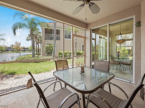 1st floor corner unit with waterfront views, extra windows for light & views of the water. Short walk to the pool & plenty of guest parking. A single car garage attached to the home with access into your unit makes this the ideal place for you to use as your winter retreat or your new home. This 2 bedroom 2 bath unit is spacious, has a den that can be used as a 3rd bedroom/ office. The kitchen has smooth top counters, white appliances, so much counter space & plenty of cabiinets. A corner end unit adds more windows & light as well as privacy for you. The largest bedroom has a great view of water views & walk-in closet space. The guest bedroom & bath are also spacious. Did you say Ammenities, Pool/spa,dog park, fitness center,pickleball, sand volley ball, tennis, bocce ball, barbeque, community room, clubhouse, hobby room. Enjoy as many amenties & activities as you want.The Community is gated, extremely well maintained, has a park like setting. The Shops of Sandoval offer dining & shopping right outside the gate & the access to Publix & other shops are convenient. A boat ramp right around the corner, Royal Tee Golf Course so close. no furnitue now