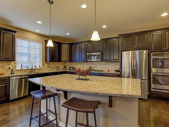 This beautifully updated home is immaculate and move in ready! Step inside to wide plank hardwood floors that extend through most of the main level, including the family room featuring a gas fireplace with brick surround. Gorgeous kitchen boasts mocha espresso cabinets, slab granite countertops and subway tile backsplash, plus stainless steel double ovens and a gas cooktop. Entertain at the island or host guests in the formal dining room with convenient butler's pantry. Relax on the coverered patio all year long and enjoy having no homes directly behind. Upstairs master is highlighted by the five piece deluxe master bath with large shower and walk in closet. Two additional second floor bedrooms and the loft are serviced by a full hall bath with granite countertops and the separate upstairs laundry room. Details include wrought iron at the stairway and coffered ceilings, central air and a three car garage. Located in a golf and pool community in the Cherry Creek School District.