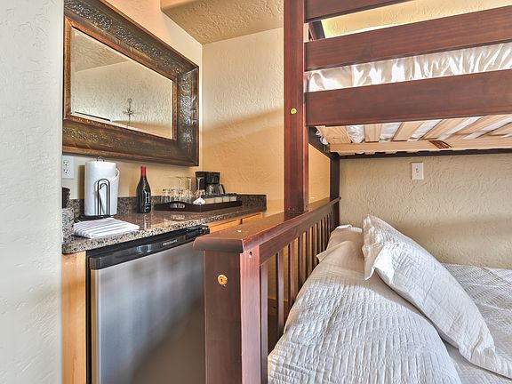 This hotel room unit offers a great bunk room with two sets of twins over two sets of full-size beds, fireplace, 40" smart TV and private bathroom. The suite has a mini fridge and coffee maker, perfect for those late night snacks of early morning coffee.