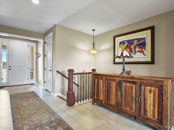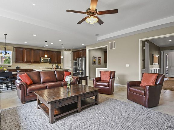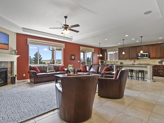 Welcome home to this remarkable single story home with extraordinary mountain views backing to open space. This home sits on an almost 1/2 acre private lot situated on a cul-de-sac with ample space between the houses. Upon entering this peaceful retreat, the foyer will greet you with an abundance of natural light, high ceilings, and spaciousness. The family room has a warm gas fireplace, large picture window, and an in-wall surround sound speaker system. The eat-in gourmet kitchen has a large island with seating, a separate walk-in pantry, gas stove, vented microwave, stainless steel appliances including "smart" double ovens, and extended cabinets in the kitchen for additional storage. The tech center off the kitchen makes a perfect operation center for the home. Step outside onto the covered deck to enjoy the quiet summer evenings and watch the sun set. The main floors are 20x20 tiles in all the high traffic areas and engineered hardwood floors. The primary suite has an ensuite 5-piece deluxe bathroom and a custom walk-in closet with built-ins. Enjoy watching the wildlife from the bay window! The laundry room has upper and lower cabinets with a sink. The walkout finished basement has 9-foot ceilings with an open great room with surround sound in-wall speakers, the 4th bedroom with large walk-in closet, and a 3/4 guest bathroom. There is a bonus/flex room in the basement that could be a 2nd office, workout room, or 5th bedroom. Walk out of the basement onto the paver patio and listen to the water feature. The backyard is a gardener's delight with native grass, flowers and trees. The abundant wildlife and birds grace the backyard daily. Lots of storage available in the basement, and in the 3rd car garage. Prime location close to Plum Creek golf course, downtown Castle Rock, Douglas County Fairgrounds and more. Original owners have taken meticulous care of this lovely home and it will make a fabulous home for the most discriminating buyers!