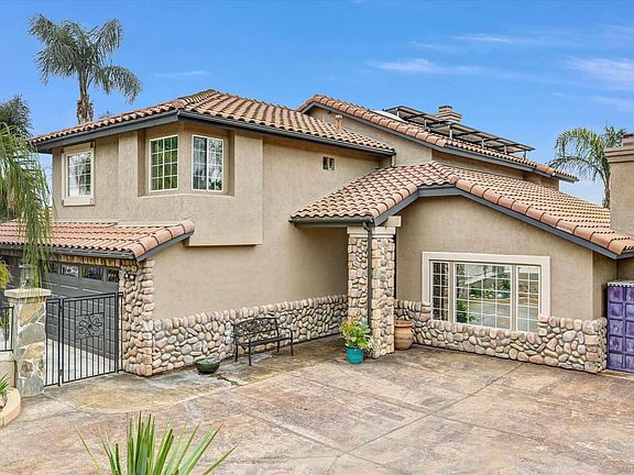 The time has come for you to live in this breathtaking Alpine Oasis. Pride of ownership can be found in every corner of this 4Bd/4Bth, 2 story, 2325 SF unique home that rests on a 1.06 AC property & offers everything you need to enjoy life from this tranquil neighborhood in Alpine. The interior of this home will CAPTURE your heart with the comfort & warmth of its 3 fireplaces, real stone accent walls, vaulted ceilings, numerous skylights, travertine floors & the spacious custom built kitchen with high-end appliances for the culinary aficionado. The exterior of this home will UNLEASH the fun entertainer inside of you with resort style landscaping, countless palm trees that surround a large heated pool/spa, a fully equipped outdoor bar with sound system & TV, 2 BBQ grills, a pizza oven & fire pits. Additional flat open space allows for RV parking (with existing hookups/pump station), fun & games for kids OR for you to build an ADU! Another highlight is the Master Bedroom, which opens to a West facing terrace for you to enjoy gorgeous sunsets every day. The 3 car garage has cabinets throughout for you to organize your favorite tools. There are also 2 enclosed sheds on the property for extra storage or create a workshop/studio for your next hobby. The home also has +40 fully paid solar panels that eliminate any energy bill concerns. This is truly a unique home that must be seen in person to appreciate the attention to detail & tremendous potential that the property offers. Come see it for yourself & don't miss the opportunity to make this Alpine Oasis your home!
