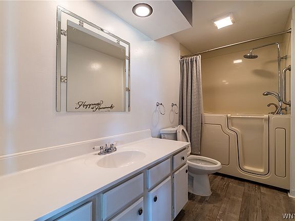 adorable Wilson home with large yard and no rear neighbors! Have piece of mind, with a maintenance free exterior, updated windows, and newer metal roof. Enter through a large mudroom with plenty of storage to the spacious living room. The open concept eat-in kitchen, with updated appliances, has abundance of cabinetry. Enjoy the double sided fireplace from either your living room, or spacious family room with cathedral ceilings. Two bedrooms and a large full accessible full bath, complete the lower level of this home. Walk up the floating staircase, to the large master bedroom with master bath. This home has a large 2.5 car garage, and full basement for additional storage. 2022-09-28
