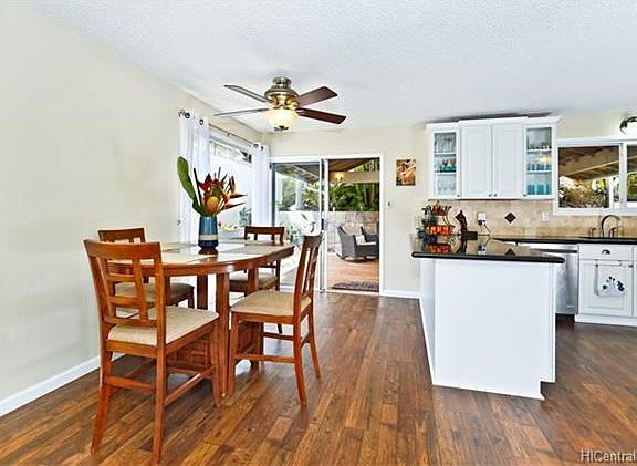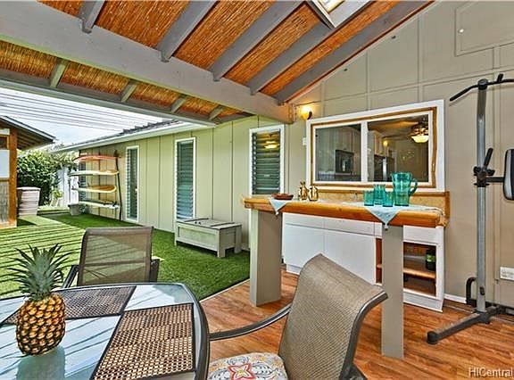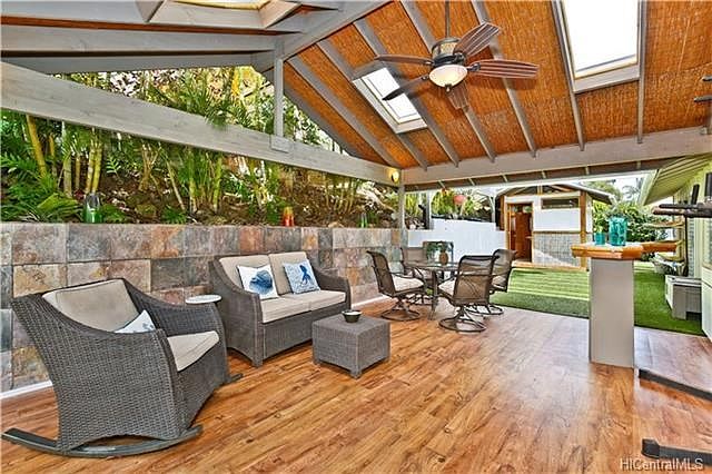 The crown of Kaopa! Casual yet elegant hillside custom home rises above & offers sweeping panoramic views to Olomana . Long private driveway to flag lot provides privacy. Standout features: split level, open floor plan w/12-14' vaulted ceilings, custom cabinetry, earthy colored concrete countertops, dining area w/built-in banquet & bar seating. Wonderful windows, 4-door glass slides into pockets to enlarge/combine indoor-outdoor living while tredding on Travertine floors. Enviable master suite w/walk-in closet, double shower/vanity, sep water closet. Bamboo flooring in bdrms complements white & Tuscan gold paint &travertine colors. Oversized 2-car encl'd garage PLUS bonus storage/workroom & nominal yardwork. Underground wiring, sidewalks & wide avenue.