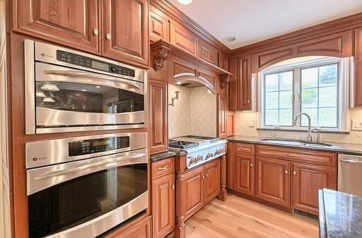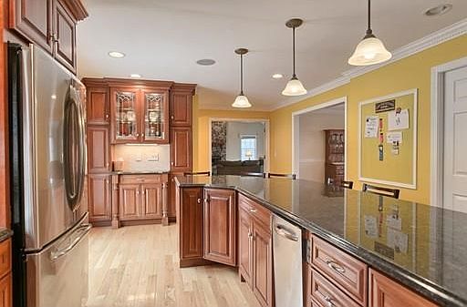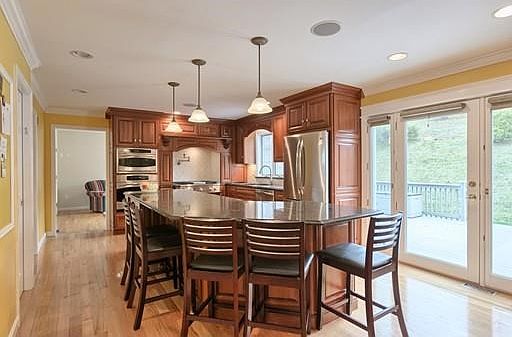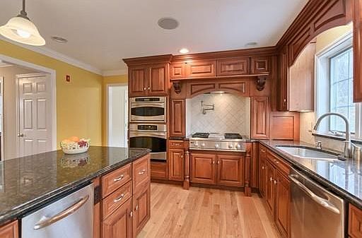 Showplace kitchen in this handsome Bradford colonial. Thoughtfully-designed chefs space w 11-foot granite island, rich woodwork, built-in hutch, appliance garage, gas stovetop w griddle, pot filler, wall oven, and more! 1st level also includes dining room, living room w fireplace, playroom w picture window and window seat, plus 24-foot great room w cathedral ceiling, french doors, and floor to ceiling stone hearth fireplace. 2nd floor has 4 bedrooms and 2 full baths, including en suite master with walk-in closet. Basement includes a room framed and ready for finishing plus a workshop room, a mudroom w sink and walk-in storage. Central AC, hardwood floors, crown molding, built-in ceiling speakers, 2 furnaces, 2nd floor laundry, maintenance-free composite decking w natural gas hookup for bbq and retractable awning. Private back yard and huge play area at back of property. Bradford commuter rail and easy access to Rtes 495 and 95 too.