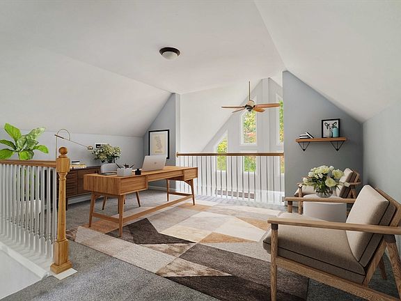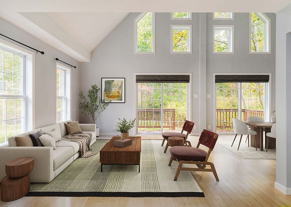 Flex loftSoaring cathedral ceilingNatural privacyPersonal suburban sanctuaryLush land abut conservationStriking wall of windowsGleaming wood floors