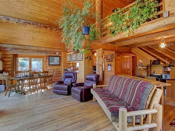 This lovely log home sits privately on top of a knoll with views of the territory and mountains. 3 bedrooms 2 bath with large open beam ceilings 22' high sitting on 5.3 acres. The kitchen boasts stainless steel appliances & pine cabinets while the floors are solid oak except for the bathrooms which are tile. Upstairs has a nice landing which could be an office, exercise or sitting area. Outside features include a goat pen with barn, chicken coop, large firewood shed, 2 carports and a storage shed. The dog run is unique, giving dogs access to the expansive wrap-around deck on the house. The land has been cleared of underbrush making it fire resistant while the beautiful timber remain. There is plenty of parking for RV's or even trucks. This is a unique yet lovely setting, private yet just 7 minutes to Shady Cove & backed by over 500 acres of BLM land. The Rogue River and camping is minutes away, so as they say in real estate...this has great location! Sellers are highly motivated!