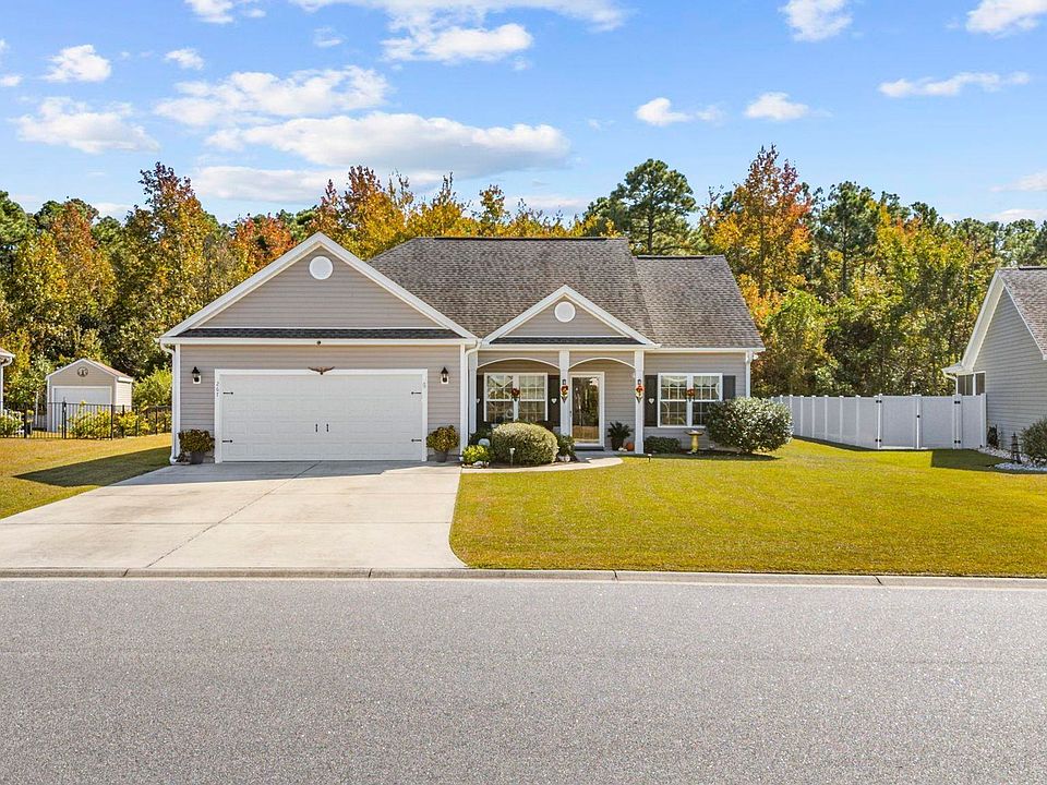 Nestled within the desired community of Heartwood, this 3 bedroom 2 bathroom home is in immaculate condition that offers an unbeatable combination of luxury and practicality. The home itself features an open floor plan and upgrades throughout; LVP flooring, crown molding, vaulted and tray ceilings, stainless steel appliances, granite countertops, an extended master suite with a garden tub and walk in shower, and tile floors in the bathrooms and laundry room! The exterior features a shaded front porch and a wooded view from the back that allows you the privacy to enjoy your large yard. A screened in patio addition was added to make your outdoor area even bigger to relax and entertain. That combined with a uncovered patio portion perfect for grilling and a herb garden. The residents benefit from a desirable neighborhood lifestyle complete with access to a community pool and low HOA fees. The location is incredibly convenient, being just minutes from the award winning Aynor District Schools, and just 1/2 mile from Highway 22, providing easy access to the renowned beaches of Myrtle Beach and North Myrtle Beach. You'll also be just minutes away from all that downtown Conway has to offer and the picturesque Historic River Walk. Don't miss this opportunity to own a beautiful home that perfectly blends community perks, affordability, and coastal accessibility!