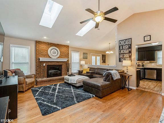 Way bigger than it looks, this ranch is nicely updated and in the most perfect location! Situated in highly sought-after Foxmoor across from park, baseball diamond, soccer field & ponds. Walking distance to schools, Metra, gym, and shopping! Fully fenced backyard is nicely landscaped and features a massive deck great for summer cook-outs. Enter through the front door into your living room bursting with space and natural light, sporting vaulted ceilings w/skylights and a majestic brick fireplace! Oak hardwood floors sprawl throughout most of the main level which has been painted in neutral tones. Kitchen has been updated with stone tile, quartz countertops, and stainless steel appliances. Full finished basement doubles your living space totaling over 3000 sq ft with the 4th bedroom, 3rd full bath, rec room, den, and bar! Extra wide driveway too (3-car width)! All of this plus highly acclaimed FRG district 3 middle & elementary schools and Cary-Grove High!!! This one won't last long.
