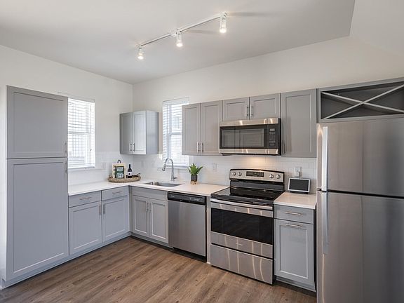 Our Villas feature private patio & yard, 9-12 foot ceilings, modern farmhouse style, wood grain flooring throughout, full-sized washer & dryer and ceiling fans. Our luxurious kitchens feature quartz countertops, stainless steel appliances & shaker-style cabinets.