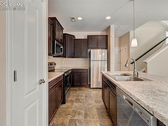 This immaculate end unit townhome in desirable Gold Hill Mesa has an appealing design, mountain views, unparalleled community amenities and incredible outdoor recreation just steps from the charming west-facing covered front porch to take in views of Cheyenne Mountain. Enter into a spacious open-concept main level with a large living room and dining area, and a beautiful kitchen with newer appliances, upgraded cabinets, a pantry, and a center island with counter seating. The main level is complete with a powder room off the garage and a large storage closet. The bright and open staircase leads to the upper level with 3 bedrooms, including the primary bedroom suite boasting mountain views, a walk-in closet, and a private bath with two vanities and a walk-in shower. The upper level includes a shared full bathroom, the laundry, and two other bedrooms. This pedestrian-friendly neighborhood was designed with traditional architecture and greenbelts throughout providing easy access to parks and recreation. A clubhouse, fitness center, and extensive green spaces encourage interaction and provide ample opportunities for residents to get outside and enjoy the amazing foothills scenery. Bear Creek Regional Park is nearby, featuring a renowned dog park and extensive trail system linking Gold Hill Mesa to downtown. Many residents bike to work!