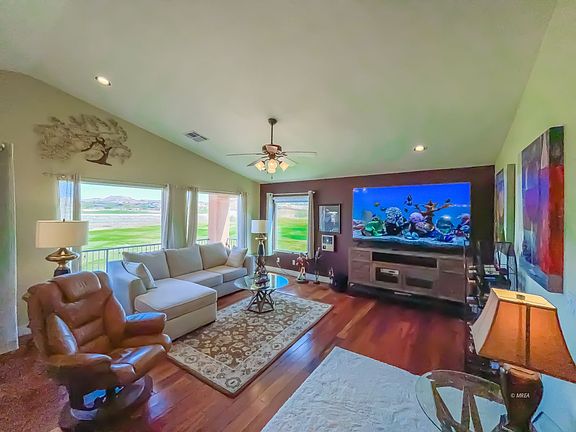 VIEWS!! Spacious!!! Upgraded to the MAX!!! Two story townhouse with walk out basement. 3 Br, 2.5 Ba, 2251 sf! All entry level living except for 3rd br & guest living room downstairs. Incredible views and privacy over the Oasis Club driving range with distant fairways, mesas & mountains. No other homes in your immediate close view! You can see three states from here! Faces North North East to Utah & Arizona.. Beautiful! Upgrades include luminous Brazilian Koa hard wood floors in living and dining room, gorgeous BRAND NEW MATCHING Beko stainless steel kitchen appliance, granite counters, new tile backsplash, new carpet in upstairs primary and downstairs suites/living room, new window coverings throughout new wood laminate floor in upstairs 2nd br/office, GORGEOUS REMODELED MASTER BATH WITH CUSTOM WASH BASISNS, INCREDIBLE LARGE WALK IN SHOWER, & CUSTOM CLOSET WORKS. WITH FULL PRICE OFFER, NEW LIVING ROOM 85' SONY BRAVIA TV WILL STAY. Plus Mesquite Vistas rec ctr w/pool, spa, tennis, pickle ball, + more. HOA maintains all landscape, and exterior, including insurance, sewer and trash. Great location walk to golf, amenities, casinos, dining, & all the best of Mesquite living. Golf living