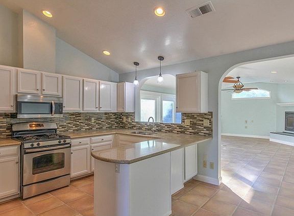 Traditional home, that will immediately show you the open floor plan, allowing for seamless entertaining from the kitchen, dining and living room all accented by grand picture windows welcoming floods of natural light. Sophisticated kitchen boasting chic glass tile back splash, & a peninsula for stool bars . Spacious master suite w/ sliding glass doors to the yard and en suite bath feat a luxurious vanity & glass shower.