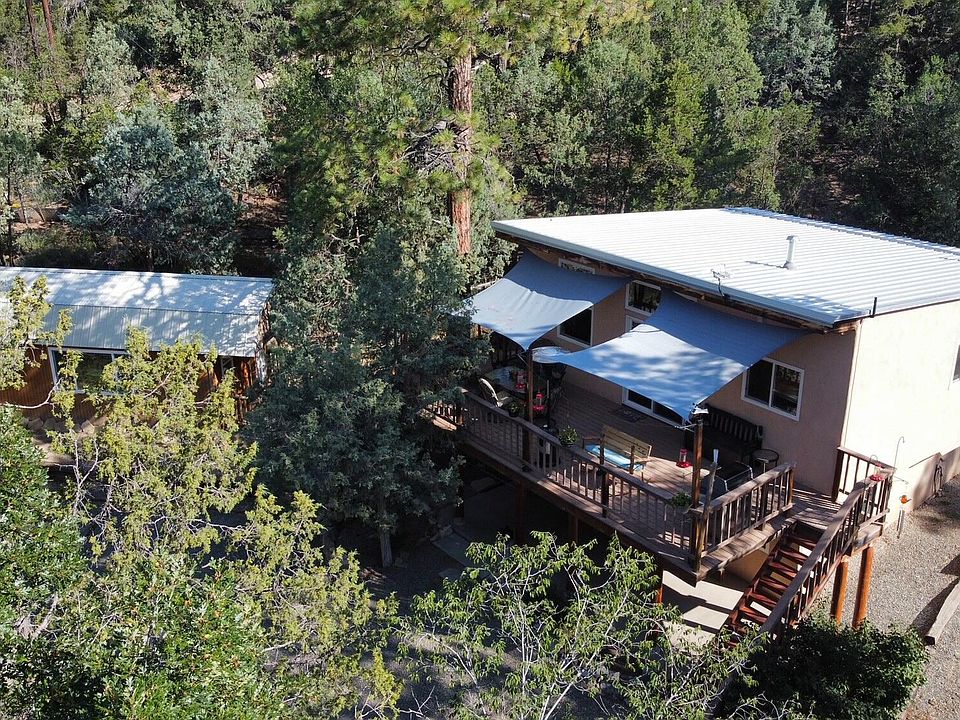 Rare Mountain Retreat Opportunity! 3 bed, 1.75 bath, passive solar and updated main home, open concept with a walk out patio and upstairs deck. 1 bedroom rented guest house with bathroom and deck with great income potential or multi generational housing! Detached home office/home gym heated and cooled with a workshop on the property, and it's not included in the total sqft! 1.9 acres of ponderosa pines, 2 driveways, space cleared for a shop, protected garden, additional storage, walking paths, passive solar design, all electric main home, and a pet patio! This is a turn key mountain home/investment opportunity. Property is connected to the Tranquillo Pines Water system! Close to national forest, community park, open spaces, and an easy commute to ABQ. You will love this property!