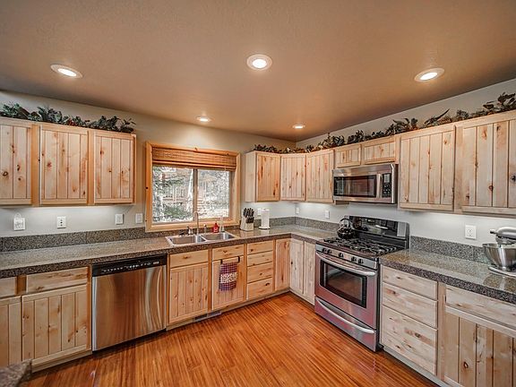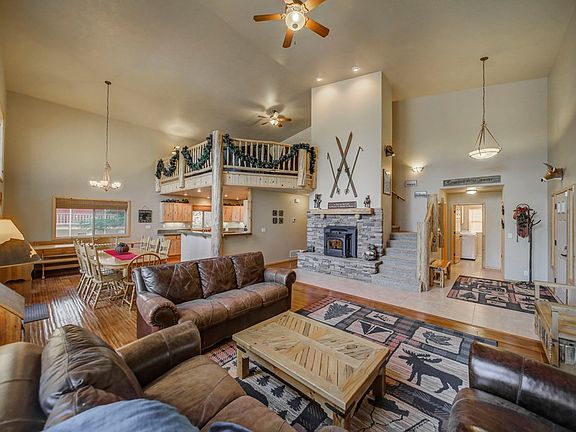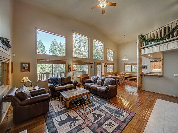 ENJOY TREE TOP VIEWS - from almost every room in this home. Fantastic design w/ commanding great room, vaulted ceilings, & a wall of windows which opens onto a 700+ sqft deck. The kitchen showcases granite tile, gas range, large corner pantry, & breakfast bar. Large Master bedroom w/ walk in closet, soaker bath, shower, & dual vanity. 2 additional bedrooms & large loft upstairs provides space to spread out. Plus a bonus bunk room in the basement. 4 car garage. Log accents throughout adds quality & charm. On demand water heater, electric forced air furnace w/ remote access, heat pump, A/C & security system. Centrally located in McCall near Payette river, lake & Rio Vista Pond. Bring the family, plus store all your toys, this home has it all!